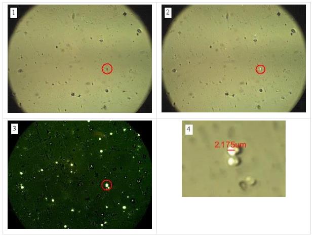 經(jīng)測量,圖2中的兩個明顯的透光點的直徑在2微米左右。參見圖4。