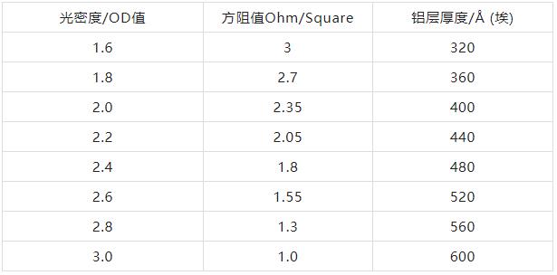 單位面積鍍鋁薄膜的電阻值越小,其鍍鋁層的厚度越厚,反之則越薄。