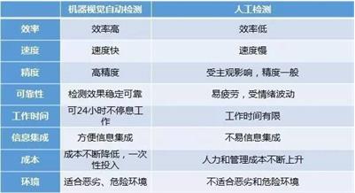機(jī)器視覺優(yōu)勢(shì):機(jī)器視覺系統(tǒng)具有高效率、高度自動(dòng)化的特點(diǎn),可以實(shí)現(xiàn)很高的分辨率精度與速度。機(jī)器視覺系統(tǒng)與被檢測(cè)對(duì)象無(wú)接觸,安全可靠。人工檢測(cè)與機(jī)器視覺自動(dòng)檢測(cè)的主要區(qū)別有: