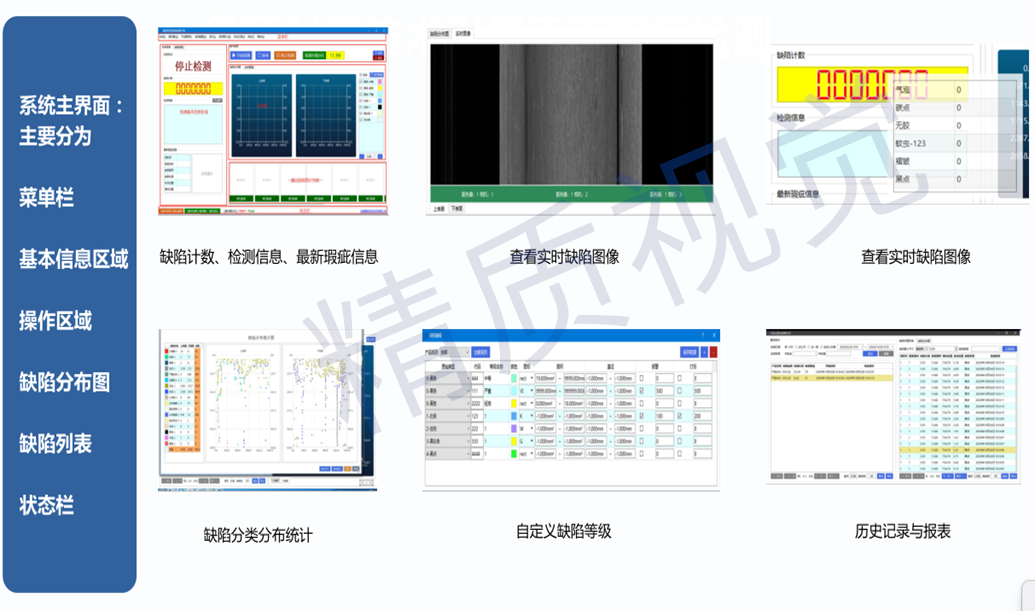 強(qiáng)大的表面缺陷模式識(shí)別功能,根據(jù)表面缺陷的特征,在報(bào)警的同時(shí),會(huì)指出導(dǎo)致該表面缺陷的設(shè)備、工藝問題所在,指導(dǎo)工人及時(shí)處理,從而有效的節(jié)約了生產(chǎn)成本、提高了產(chǎn)品質(zhì)量。因此薄膜瑕疵在線檢測(cè)系統(tǒng)成為高速薄膜生產(chǎn)線中不可或缺的檢測(cè)設(shè)備。upI機(jī)器視覺檢測(cè)設(shè)備_CCD視覺檢測(cè)_外觀缺陷檢測(cè)系統(tǒng)_精質(zhì)視覺