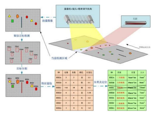 本臺設(shè)備安裝在銅箔分切機上,基本原理是將工業(yè)線陣 CCD 相機架設(shè)在材料上下表面兩側(cè),采用高亮 LED 線性聚光冷光源將材料表面照亮,通過編碼器 觸發(fā)相機進行在線高速掃描式拍攝。高速圖像處理系統(tǒng)實時獲取銅箔表面壓坑、黑點、黑線、氧化斑、異物、劃傷、銅粉、銅粒、凹凸點、墊傷、污染、 褶皺、氧化、針孔等缺陷,系統(tǒng)通過數(shù)據(jù)庫來記錄和管理缺陷的橫縱向位置、 數(shù)量、大小和圖像等信息,可通過信號控制系統(tǒng)實時進行聲光報警、缺陷記錄、自動貼標等操作。通過軟件深度學(xué)習(xí)最終實現(xiàn)缺陷的分類。LBX機器視覺檢測設(shè)備_CCD視覺檢測_外觀缺陷檢測系統(tǒng)_精質(zhì)視覺